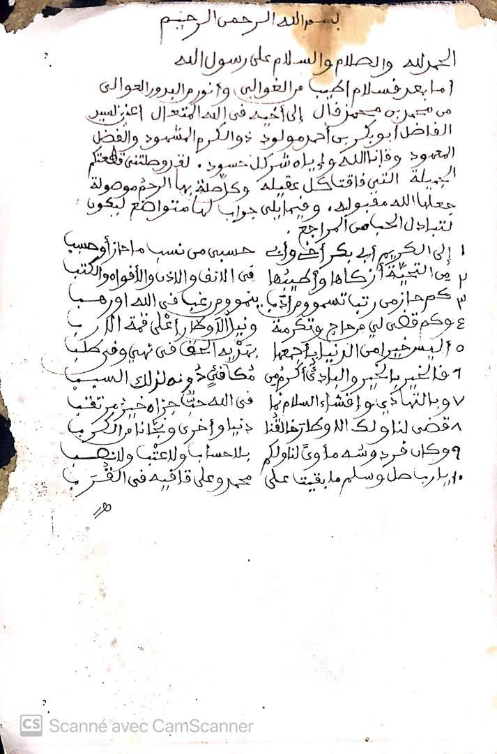 سلام كأحسن ما يكون وتحية طيبة كالدر المكنون من أبي بكر بن أحمد مولود إلى من أكرمه الكريم ولا فارقنا وإياه النعيم